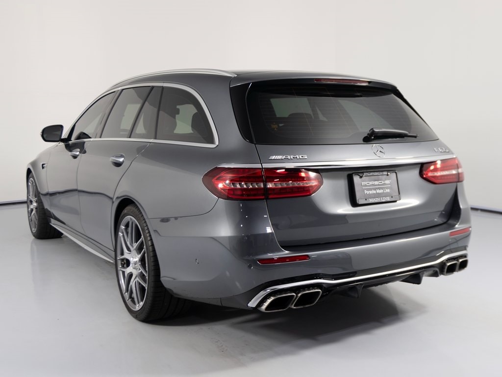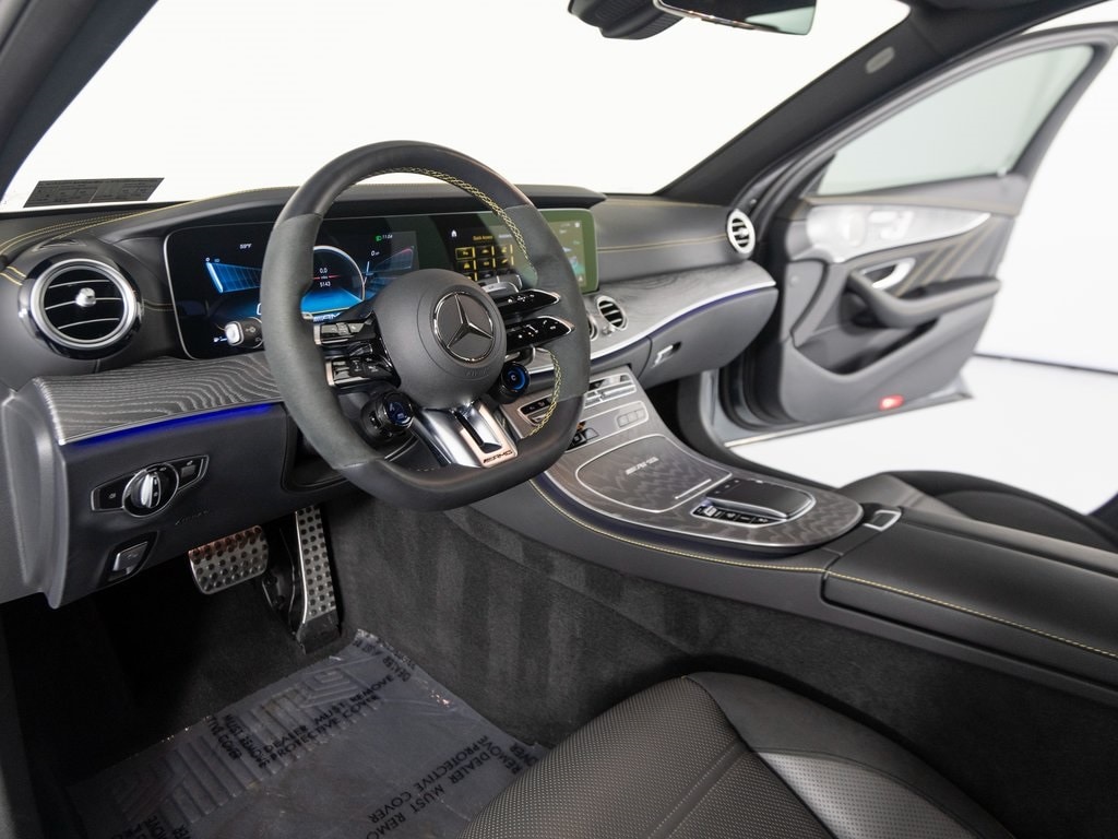 You are looking at a 2021 Mercedes-Benz E-Class E 63 S AMG with 5,117 miles. The options include: AMG Exclusive Nappa leather in titanium grey and black, pre-installation for navigation services, smartphone integration with Apple CarPlay and Android Auto, a garage door opener, PARKTRONIC with Active Parking Assist, auto-dimming driver and rearview mirrors, increased top speed, AMG Track Pace, GPS antenna, power driver seats with memory, split-folding rear seats, driver knee airbag, PRE-SAFE system, ashtray, cupholders, storage space package, extended MBUX functions, HERMES LTE communications module, MB navigation with live traffic, AMG high-performance compound brake system, a panorama sunroof, 9-speed automatic transmission, galvanized shift paddles, heated steering wheel, touchpad, English inscriptions, AMG electronic limited-slip differential, tire pressure monitoring system, AIRMATIC suspension, power folding mirrors, HD Radio, pull-out sun visors, MBUX high-end multimedia system, anti-theft alarm system, dual-zone climate control, aluminum roof rails, remote key with panic button, AMG body styling, Burmester surround sound system, advanced alarm with parking collision detection, 12.3" center display, HANDS FREE ACCESS, heated washer system, premium interior lighting, KEYLESS-GO, power liftgate, multi-color ambient lighting, inductive wireless charging with NFC pairing, large capacity fuel tank, air conditioning amplifier, identification label with VIN, TIREFIT kit, AMG DYNAMIC SELECT, KEYLESS-GO Package, surround view system, mirror package, Warmth & Comfort Package, AMG interior, AMG exterior, MBUX Navigation Plus, passenger seat weight sensing system, 4-way lumbar support, AMG illuminated door sills, 12V power plug in the cargo area, red brake calipers, AMG performance exhaust system, and the AMG DRIVE UNIT.